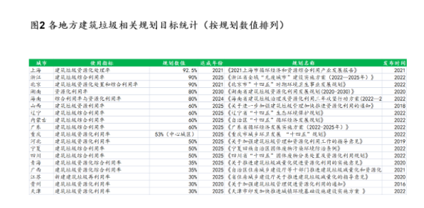 聚焦到省市級(jí)規(guī)劃,據(jù)辰于統(tǒng)計(jì),截至2022年12月底,全國(guó)已有超過(guò)20個(gè)省份頒發(fā)了省一級(jí)的建筑垃圾資源化相關(guān)管理辦法或規(guī)劃,到2025年的目標(biāo)值從35%到90%不等(見(jiàn)圖2),這也體現(xiàn)了各地方政府對(duì)建筑垃圾處置的重視。