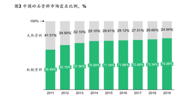 另一方面是建筑垃圾再生產(chǎn)品市場(chǎng)有望打開(kāi)。地方政策正在推動(dòng)再生磚和再生混凝土產(chǎn)品應(yīng)用到我國(guó)市政相關(guān)建設(shè)當(dāng)中。如河北省于2022年規(guī)定市政基礎(chǔ)設(shè)施工程中使用再生粗骨料、再生砌塊(磚)、再生瀝青混凝土等產(chǎn)品占同種類產(chǎn)品的比例不低于20%。2021年,河南洛陽(yáng)也規(guī)定在政府性投資項(xiàng)目中再生產(chǎn)品替代天然砂石建材產(chǎn)品的比例不得少于30%。與此同時(shí),我國(guó)天然砂石骨料資源短缺、價(jià)格高企的勢(shì)態(tài)長(zhǎng)期持續(xù),天然砂石骨料的市場(chǎng)占比逐步減小,再生產(chǎn)品有望打開(kāi)銷路(見(jiàn)圖3)。