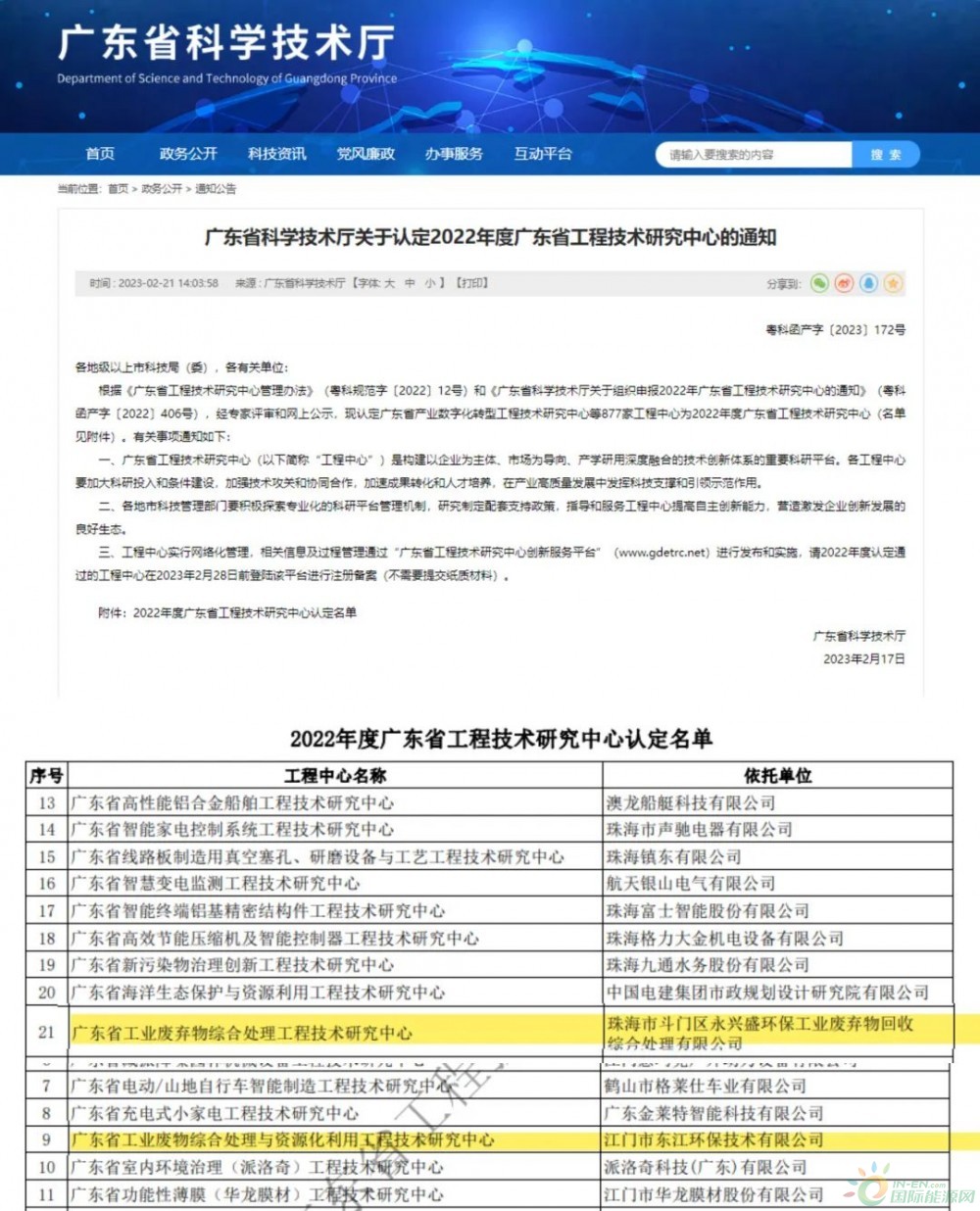 廣東省科技廳公布2022年度廣東省工程技術(shù)研究中心名單,東江環(huán)保所屬珠海市斗門區(qū)永興盛環(huán)保工業(yè)廢棄物回收綜合處理有限公司、江門市東江環(huán)保技術(shù)有限公司(簡(jiǎn)稱“珠海永興盛、江門東江”)分別獲得“廣東省工業(yè)廢棄物綜合處理工程技術(shù)研究中心”“廣東省工業(yè)廢物綜合處理與資源化利用工程技術(shù)研究中心”認(rèn)定。