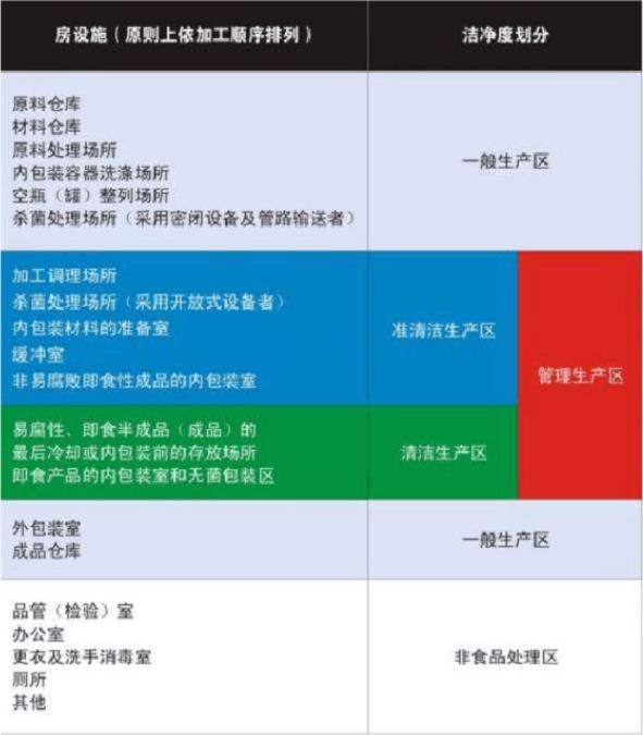 生產(chǎn)車間的安排及衛(wèi)生等級的劃分為了便于對不同生產(chǎn)區(qū)域進行設(shè)計和衛(wèi)生管理,通常將食品工廠車間按車間(區(qū)域〉的潔凈度不同劃分為非食品處理區(qū)、一般生產(chǎn)區(qū)、準潔凈生產(chǎn)區(qū)和潔凈生產(chǎn)區(qū)。準潔凈生產(chǎn)區(qū)和潔凈生產(chǎn)區(qū)屬于管制(監(jiān)管)生產(chǎn)區(qū),如表1-1所示: