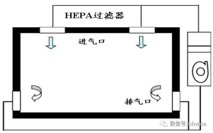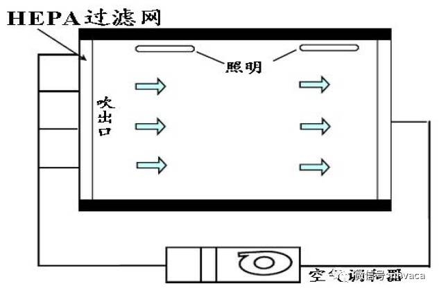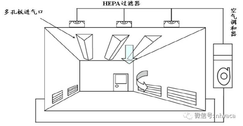 通過(guò)凈化車(chē)間屋頂?shù)母咝н^(guò)濾器出口向屋內(nèi)送風(fēng).通過(guò)墻壁的排氣口回風(fēng),以玻璃纖維為主