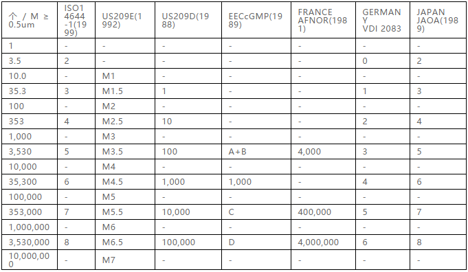 各國(guó)潔凈度等級(jí)近似對(duì)照表