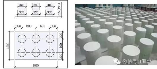 該工程為三層廠房結(jié)構(gòu)(局部四層),總建筑面積約7萬平米。建筑無地下室,結(jié)構(gòu)伸縮縫左側(cè)為框架結(jié)構(gòu),伸縮縫右側(cè)為框剪結(jié)構(gòu)。建筑2~3層4~21軸為潔凈度二級(即100級)的潔凈房,為滿足潔凈度要求,4~21軸的3層樓板采用了華夫樓板。4~9軸采用高500mm,9~21軸采用高600mm,直徑350mm,中心距600的圓孔一體成型華夫板,鋪排完成后孔筒縱橫方向在同一直線,筒間滿布250×500(600)mm的暗梁。標(biāo)準(zhǔn)的六孔華夫板與實(shí)物圖如下圖所示。華夫板的施工面積達(dá)12,000m2。