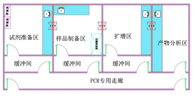 將PCR過程分為試劑制備、樣品制備和PCR擴增檢測三個獨立的實驗區(qū)。整個區(qū)域有一個整體緩沖走廊。每個獨立的實驗區(qū)都有一個緩沖區(qū)。
