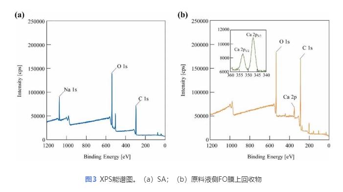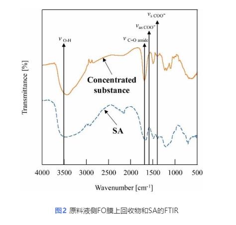 - 與SA相比,濃縮物中COO-的反對稱vas和對稱vs伸縮振動峰向右移動,表明原料液側的SA橋接了反向滲透的Ca2+;
