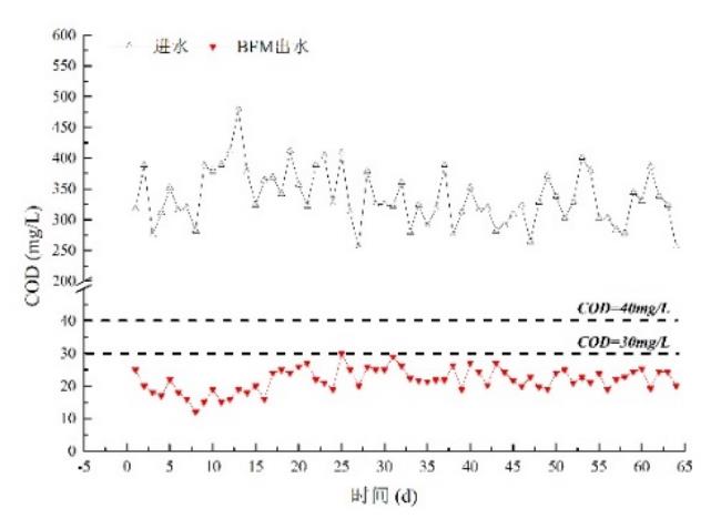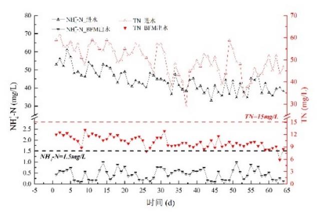 經(jīng)過20 d調(diào)試,新建項(xiàng)目出水實(shí)現(xiàn)了穩(wěn)定達(dá)標(biāo)。系統(tǒng)各污染物去除效果如圖4所示,進(jìn)、出水取樣點(diǎn)分別為細(xì)格柵出水和BFM工藝出水。