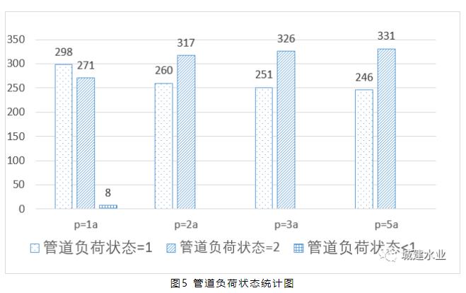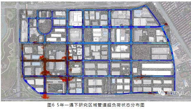 在本次研究過程中,通過調(diào)整降雨的重現(xiàn)期,以模擬不同降雨強(qiáng)度下整個排水管網(wǎng)系統(tǒng)的管道超負(fù)荷狀態(tài),模擬結(jié)果如圖5所示,可知在1年一遇時,整個排水管網(wǎng)系統(tǒng)有47.0%的管道超負(fù)荷狀態(tài)為2,51.6%的管道超負(fù)荷狀態(tài)為1,僅 1.4%的管道不處于超負(fù)荷狀態(tài),可知現(xiàn)狀管網(wǎng)系統(tǒng)的排水能力不足,主要是因下游發(fā)生頂托造成,應(yīng)考慮優(yōu)先改善下游的排水能力。2年一遇、3年一遇、5年一遇管道超負(fù)荷狀態(tài)為2的管道占比分別為:54.9%、56.6%、57.4%,可知隨著降雨強(qiáng)度的增加,管道超負(fù)荷狀態(tài)為2的數(shù)量增加,管網(wǎng)系統(tǒng)的排水能力下降。根據(jù)《上海市城鎮(zhèn)雨水排水規(guī)劃(2020-2035年)》規(guī)劃方案介紹[3],現(xiàn)代雨水排水系統(tǒng)應(yīng)基本達(dá)到3-5年一遇的排水能力,則本次研究區(qū)域有56.6%以上的管道沒有達(dá)到設(shè)計(jì)標(biāo)準(zhǔn)。