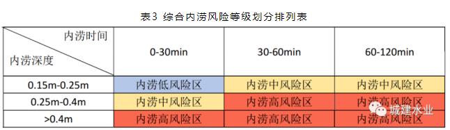 在以上劃分依據(jù)的基礎(chǔ)上進(jìn)一步劃分綜合內(nèi)澇風(fēng)險排列等級,分別為內(nèi)澇低風(fēng)險區(qū)、內(nèi)澇中風(fēng)險區(qū)、內(nèi)澇高風(fēng)險區(qū)。同時,根據(jù)積水深度和積水時間進(jìn)行對應(yīng)的排列組合事件,得到綜合內(nèi)澇風(fēng)險劃分的閾值,以對本次研究區(qū)域不同降雨強(qiáng)度下的綜合內(nèi)澇風(fēng)險分布情況進(jìn)行統(tǒng)計(jì)。