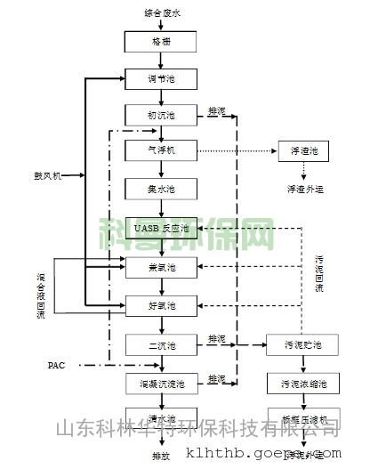 - 生物接觸氧化法:在生物接觸氧化池中充填填料,底部曝氣氧化,讓廢水浸沒填料,生物膜從填料中分離后隨水流進(jìn)入二沉池,達(dá)到凈化廢水目的。該工藝具有抗沖擊負(fù)荷能力強(qiáng),生物膜中微生物種類多,活性生物的微生物數(shù)量多,不會(huì)產(chǎn)生污泥膨脹等特點(diǎn),但也存在反應(yīng)池中曝氣不均勻,產(chǎn)水率較低等問題。