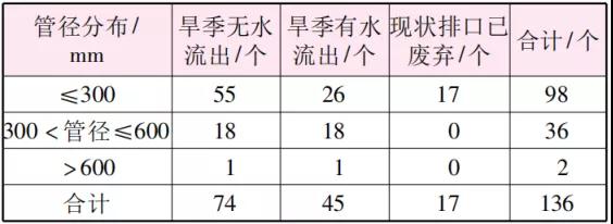以1條暗涵為例,某河道上游暗涵長度約1 km,斷面尺寸在1.5m×2.0m~2.7m×2.1m之間,根據(jù)排查成果顯示,此暗涵排放口總數(shù)為136個(gè),其中排查時(shí)有水流出的排放口有45個(gè),根據(jù)水質(zhì)檢測結(jié)果顯示,其有水流的排口,氨氮濃度大于20mg/L排口有37個(gè)。根據(jù)管徑分布,排放口管徑≤300mm的有98個(gè),管徑在300~600mm的有36個(gè),管徑大于1000mm的有1個(gè),具體管徑分布詳見表2。根據(jù)排放口調(diào)查結(jié)果、檢測水質(zhì)以及已有管線資料對排放口進(jìn)行判定,在45個(gè)有水流出的排放口中,排水戶污水直排的排放口有22個(gè),雨水管混流污水的排口23個(gè),排口分布詳見圖7。