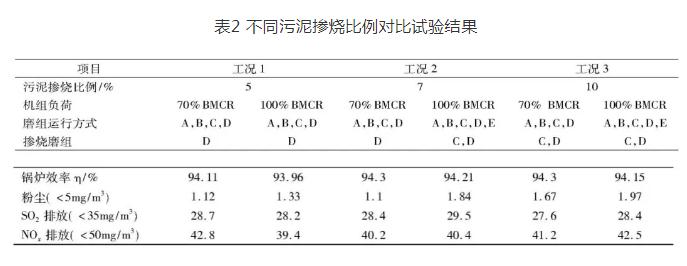 在進(jìn)行污泥摻燒比例為5%、7%、10%的3種不同比例,以及機(jī)組70%負(fù)荷(主蒸汽流量>700 t/h)和100%負(fù)荷(主蒸汽流量>900 t/h)工況下的對比試驗(yàn)過程中,鍋爐燃燒穩(wěn)定、火焰明亮、爐膛負(fù)壓正常,鍋爐主、再熱蒸汽參數(shù)達(dá)到設(shè)計(jì)值,鍋爐排煙溫度正常,鍋爐各輔機(jī)電流在額定范圍內(nèi),制粉系統(tǒng)、輸煤系統(tǒng)出力穩(wěn)定,污泥輸送系統(tǒng)各項(xiàng)功能投入正常,鍋爐效率并未發(fā)生明顯變化(>93.46%設(shè)計(jì)值),凈煙氣參數(shù)粉塵<5 mg/m3、SO2<35 mg/m3、NOx<50 mg/m3,廢氣排放均符合環(huán)保要求。