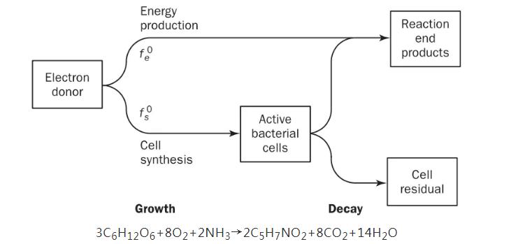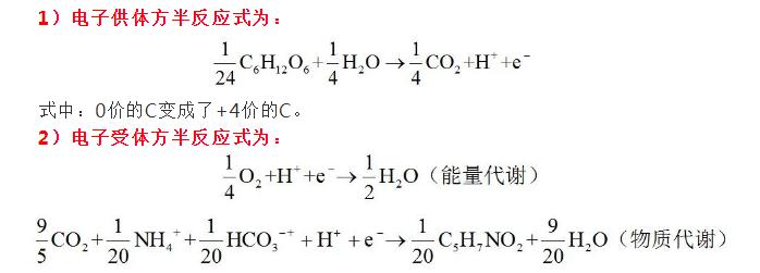 任何氧化還原反應(yīng),都是由兩方參與的,電子供體方(氧化反應(yīng))和電子受體方(還原反應(yīng)),參與的兩方必須保證電荷守恒。好氧環(huán)境下,C6H12O6作為外碳源,是提供電子供體的一方,它提供的電子有兩個(gè)去處,去用于產(chǎn)能(能量代謝),去用于微生物的增殖(物質(zhì)代謝),下式為C6H12O6同時(shí)參與能量代謝及物質(zhì)代謝的綜合表達(dá)式。