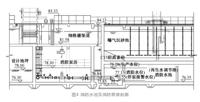 根據(jù)《消防給水及消火栓系統(tǒng)技術(shù)規(guī)范》,本項(xiàng)目同一時(shí)間內(nèi)的火災(zāi)起數(shù)按1起考慮。消防給水1起火災(zāi)滅火用水量應(yīng)按需要同時(shí)作用的室內(nèi)外消防給水用水量之和計(jì)算,兩座及以上建筑合用時(shí),應(yīng)取最大者。鄭州新區(qū)污水廠二期工程消防用水量最大的建筑為干化車間,經(jīng)計(jì)算消防總水量為1 026 m3。消防水源采用污水廠處理后的再生水。本項(xiàng)目消防水池有效容積為1 050 m3,根據(jù)《消防給水及消火栓系統(tǒng)技術(shù)規(guī)范》要求,應(yīng)設(shè)置能獨(dú)立使用的兩座消防水池,見圖2。因工藝水力高程需要,細(xì)格柵及曝氣沉砂池豎向標(biāo)高位于設(shè)計(jì)地坪以上,可利用細(xì)格柵及曝氣沉砂池下部空間設(shè)置消防泵房、再生水泵房、再生水調(diào)節(jié)池和消防水池,見圖3~圖5。