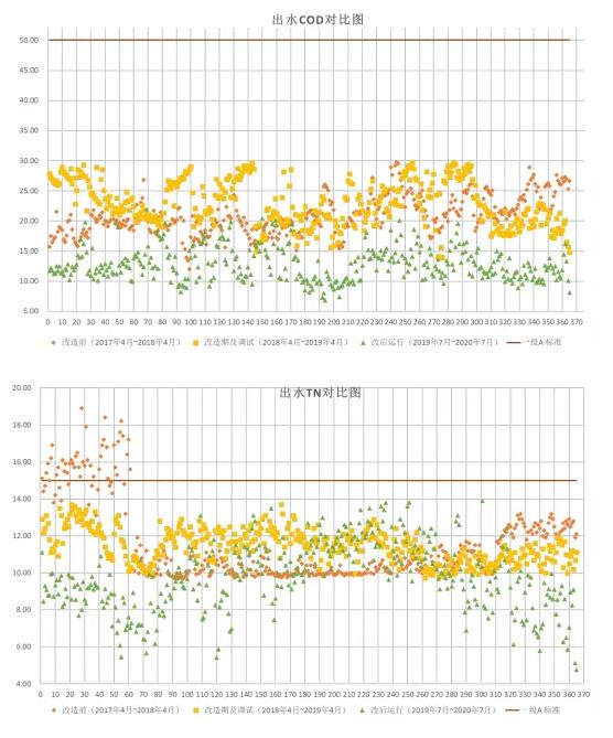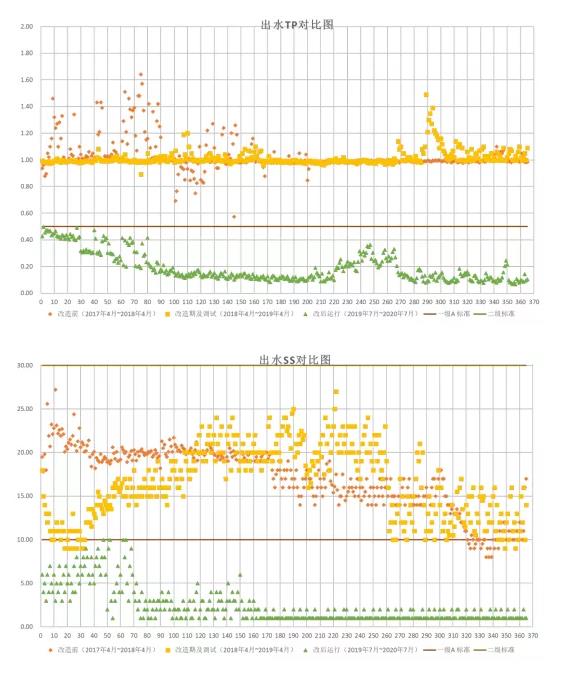 本項(xiàng)目完成改造后出水全面優(yōu)于一級A標(biāo),較好的達(dá)到了工程目標(biāo),其改造前、改造中、改造后的出水水質(zhì)對比如下圖所示: