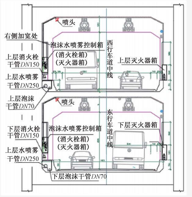 (3)泡沫-水噴霧消防系統(tǒng)、消火栓系統(tǒng)及滅火器的組合滅火系統(tǒng),既有撲滅初期火災(zāi)功能,又有冷卻降溫、避免高溫引起隧道混凝土內(nèi)襯爆裂和坍塌,保護(hù)隧道結(jié)構(gòu)安全的功能。在現(xiàn)有技術(shù)條件下做到了單管雙層隧道消防安全的最大化。