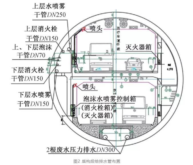 該隧道縱向管道較多:2根DN150消火栓干管、2根DN250水噴霧干管、2根DN70泡沫干管及二根DN300廢水壓力排水管。一般水底隧道多為雙管單層,在雙管隧道中間設(shè)有縱向貫穿隧道的專用管廊,用于鋪設(shè)給排水管道。而本隧道為單管雙層,無管廊。隧道明挖暗埋段主線寬度9.6m、匝道寬度7.5m,均為行車空間,管道無處可放。以上諸多管道若掛在隧道壁上,不便檢修且影響行車安全。對(duì)管道布置空間進(jìn)行大膽創(chuàng)新設(shè)計(jì):將隧道明挖暗埋段橫斷面右側(cè)加寬0.6m,加寬的空間用于布置管道;隧道盾構(gòu)段為圓形斷面,內(nèi)分上下二層車道,下層車道下方及車道兩側(cè)弧形空間用于鋪管。湖中廢水泵房的2根DN300壓力排水管敷設(shè)在下層車道下方弧形空間,沿此空間從湖中廢水泵房至湖西工作井,盾構(gòu)段各類消防管道均設(shè)在隧道上層北側(cè)弧形空間內(nèi),明挖暗埋段上、下層消防管道分別設(shè)在上、下層隧道右側(cè)加寬的0.6m空間內(nèi)。該創(chuàng)新設(shè)計(jì)使各類管道布置合理、保證了行車安全且方便檢修。給水排水管道布置分別見圖2、圖3。