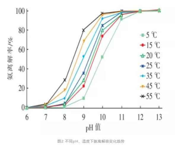 氨氮吹脫效率與液體中游離NH3比例(氨離解率)存在重要關(guān)系,而氨離解率又受pH、溫度、氣水比、氨氮濃度等條件影響。不同pH、溫度下氨離解率變化如圖2所示。