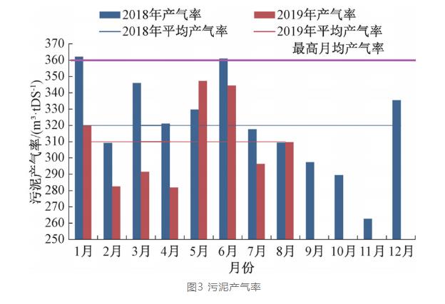 A廠升級改造后的污泥處理工藝流程見圖1,設(shè)計污泥處理能力為180 t DS/d,900t/d(含水率80%)。通過對A廠運行數(shù)據(jù)進(jìn)行分析可知,污泥處理量(見圖2)接近設(shè)計值,且有逐年升高的趨勢;對應(yīng)的產(chǎn)氣率分析見圖3,通過污泥熱水解,污泥產(chǎn)氣率有大幅提升。根據(jù)污泥有機(jī)物含量的檢測情況看,冬季污泥有機(jī)份含量較高,最高可達(dá)70%以上,夏季為50%上下,且夏季5月、6月雨水較少,運行溫度平穩(wěn),利于產(chǎn)氣,所以冬季1月份和夏季5月份、6月份產(chǎn)氣率較高,最高可達(dá)360m3/t DS,全年平均產(chǎn)氣率約為310m3/t DS。