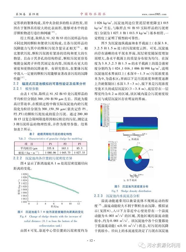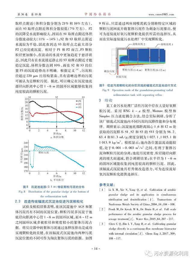 摘要:選取一座已初步形成好氧顆粒污泥的工業(yè)污水處理廠的輻流式沉淀池為研究對(duì)象,結(jié)合實(shí)際運(yùn)行情況建立固液二相流模型,分析沉淀池內(nèi)活性污泥的沉降性能和分布規(guī)律。從沉淀池底徑向距離中心1、6和12 m處取得3個(gè)污泥樣本S1、 S2和S3,其中S1的平均粒徑(294.6 μm)遠(yuǎn)高于S2(142.8 μm)和S3(55.2 μm),對(duì)應(yīng)的污泥指數(shù)(SVI)分別為56.2、63.4和81.3 mL/g。綜合試驗(yàn)結(jié)果和計(jì)算流體力學(xué)(CFD)模擬結(jié)果可以發(fā)現(xiàn),沉淀池內(nèi)顆粒污泥主要集中在半徑為1~6 m的圓環(huán)區(qū)域內(nèi)。因此,可以通過(guò)選擇性回流中心區(qū)域內(nèi)的顆粒污泥來(lái)制造選擇壓,從而實(shí)現(xiàn)連續(xù)流工藝的污泥顆?;?/p>