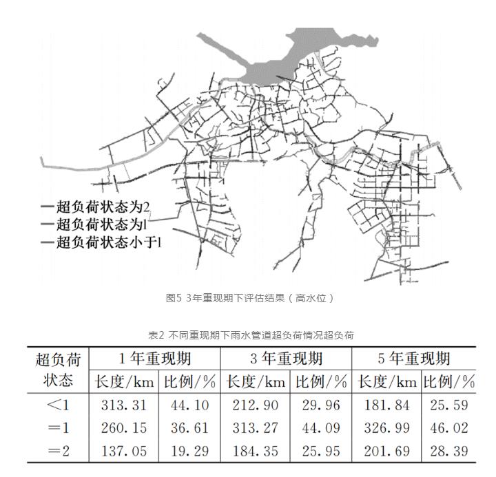 按照不同降雨條件下管道所處的運行狀態(tài)進行模擬,得到管網(wǎng)運行負荷,如圖5所示:在3年一遇降雨情況下,超負荷管道(紅色和綠色管道,圖中枚紅色為支流)主要分布在建成區(qū),其中,金山湖沿江片區(qū)雨水管道總體管道超載情況就較為嚴重;不同降雨情況下的管道超負荷狀態(tài)分布情況見表2,其中1年一遇降雨管道超負荷運行占比55.9%,3年一遇降雨管道超負荷運行占比70.04%,5年一遇降雨管道超負荷運行占比74.41%。
