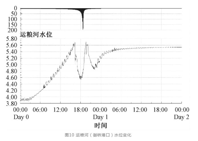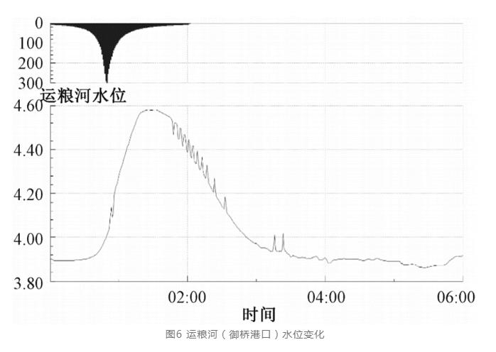 選取2015年6月26日20時-6月27日20時的實際降雨對模型進行校核,在該實際降雨情況下,24 h內(nèi)總降雨量為154mm。金山湖的初始水位為4.1m,降雨過程中的閘泵調(diào)度情況為:二擺渡閘、丹徒南閘、京口閘開啟;引航道閘、七擺渡閘、焦南閘、丹徒北閘關(guān)閉;引航道泵站(30m3/s)未開啟。以古運河支流四明河與古運河的匯流口水位數(shù)據(jù)以及運糧河與御橋港的匯流口水位數(shù)據(jù)進行率定,模擬結(jié)果與實測數(shù)據(jù)相當吻合,降雨歷時內(nèi),御橋港口水位最高上升至5.4m,四明河口水位達5.3m,模擬值與實測值差值最高為0.1m,其中御橋港水位納什系數(shù)值為0.97,四明河口水位率定納什系數(shù)值為0.89,吻合度較好。