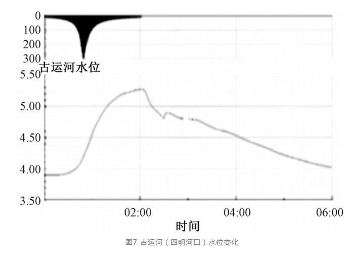 當初始長江水位、金山湖水位和內(nèi)河水位均為3.9m,暴雨強度30年一遇時(短歷時),模擬工況如下:引航道閘、七擺渡閘、焦南閘、丹徒北閘開啟;二擺渡閘在御橋河口水位達到5.7m時開啟,丹徒南閘在四明河口水位達到4.9m時開啟,京口閘在四明河口水位達到5.3m時開啟;通過模型模擬,運糧河在降雨開始1.5h時達到水位最高點約4.6m處,而后緩慢波動下降,如圖6所示。古運河在降雨開始后2h左右達到水位最高點約5.3m處,此時京口閘開啟,水位迅速下降,如圖7所示。金山湖水位從初始水位3.9m逐漸上升,降雨停止后繼續(xù)緩慢上升,由于引航道閘和焦南閘的泄洪作用,金山湖最高水位約4.04m處開始下降。