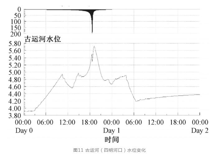 當長江高水位,金山湖及河道初始水位為為3.9m,暴雨強度30年一遇時(24 h);模擬工況如下:引航道閘、七擺渡閘、焦南閘、丹徒北閘關(guān)閉,二擺渡閘在御橋河口水位達到5.7m時開啟,丹徒南閘在四明河口水位達到4.9m時開啟,京口閘在四明河口水位達到5.3m時開啟;引航道泵站(30m3/s)在金山湖水位達到4.9m時強排。模擬結(jié)果為:運糧河水位在隨著降雨的進行先平穩(wěn)上升,而后輕微波動上升,直至水位在第16h達到5.7m開閘水位,開啟閘門后,水位迅速下降,降雨停止之后,波動幅度逐漸減小,第30h之后基本穩(wěn)定在5.5m處,如圖10所示;古運河水位在降雨后9h內(nèi)穩(wěn)上升,從初始的3.9m持續(xù)上升至4.9m處,此時開啟丹徒南閘,向京杭大運河泄洪,使得古運河水位有所下降。當降雨強度達到最大時,水位持續(xù)上升至5.3m,達到京口閘開閘水位,即使閘門開啟,河道來不及向金山湖和京杭運河泄洪,水位持續(xù)上升至5.7m,降雨停止后水位平穩(wěn)下降,之后水位趨于平穩(wěn),如圖11所示;金山湖水位在整個降雨過程中先是緩慢地上升,幾乎是在雨強最大點處上升速度發(fā)生突變。水位在降雨后2 h基本能達到最大水位,最高水位為4.9m,此時開啟引航道泵站,水位開始緩慢下降,至第48 h,水位降至4.64m處。