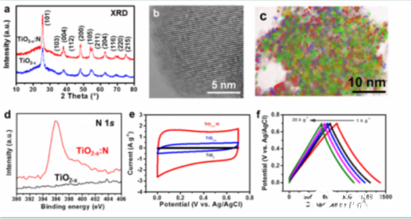 基于前期發(fā)明的“低溫還原+元素摻雜”制備高導(dǎo)電黑色氧化鈦的制備方法,發(fā)現(xiàn)9.29 at%高濃度摻雜黑色TiO2-x :N 比電容高達750 F/g,改變了寬禁帶半導(dǎo)體二氧化鈦無法應(yīng)用于超級電容器電極的傳統(tǒng)認識。
