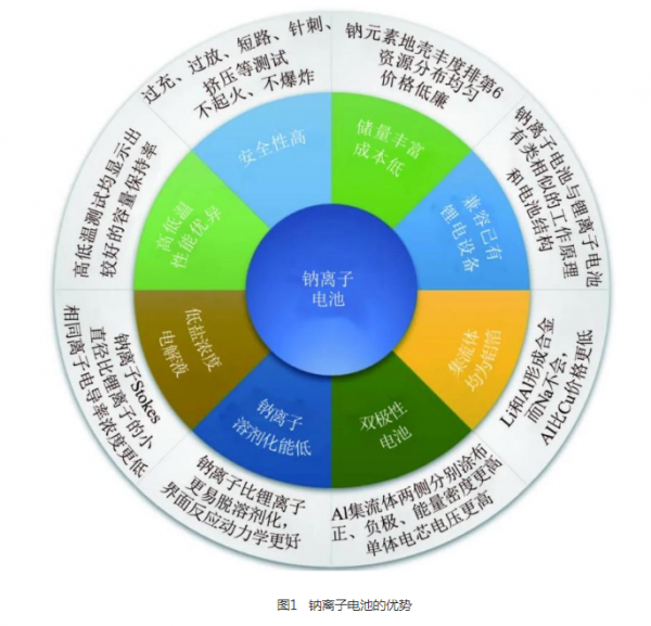 關(guān)于鈉離子電池的研究可以追溯到20世紀(jì)70年代,甚至早于鋰離子電池的研究。雖然在1991年后鋰離子電池的成功商業(yè)化吸引了大多數(shù)科學(xué)家的注意力,但鈉離子電池的發(fā)展卻從未停止,近10年來(lái)鈉離子電池的相關(guān)研究更是迎來(lái)了井噴式增長(zhǎng),另外關(guān)于鈉離子電池工程化的嘗試也常有媒體報(bào)道。2011年,全球首家專注鈉離子電池工程化的英國(guó)FARADION公司率先成立,之后在全世界范圍內(nèi)鈉離子電池公司雨后春筍般如約而至,截至目前,全球從事鈉離子電池工程化的公司已有20家以上,其中不乏松下、豐田等巨頭公司。我國(guó)首家鈉離子電池公司中科海鈉成立于2017年,雖然晚于其他國(guó)家,但是依托于中國(guó)科學(xué)院物理研究所(下文簡(jiǎn)稱物理所)的技術(shù),目前在技術(shù)開發(fā)和產(chǎn)品生產(chǎn)上都已初具規(guī)模。目前根據(jù)最新的研究結(jié)果發(fā)現(xiàn)了鈉離子電池的諸多優(yōu)勢(shì),除了鈉資源儲(chǔ)量豐富的優(yōu)勢(shì)之外,還具有高低溫性能優(yōu)異、安全性高、可用低鹽濃度電解液等優(yōu)點(diǎn)(圖1),一些技術(shù)指標(biāo)甚至優(yōu)于鋰離子電池,展現(xiàn)出巨大的開發(fā)潛力。
