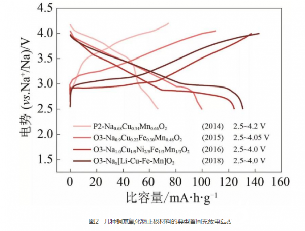 提高活性元素比例是提升層狀氧化物比容量的慣用思路,但這一思路對(duì)于Cu-Fe-Mn基正極卻不甚適用,因?yàn)橹苯犹岣逤u或Fe的含量往往會(huì)導(dǎo)致雜相的生成,導(dǎo)致性能惡化。Cu、Fe和Mn有著微妙的取代關(guān)系,需要精細(xì)的比例調(diào)控,這是在低成本正極材料探索過(guò)程中遇到的一個(gè)關(guān)鍵問(wèn)題。通過(guò)進(jìn)一步設(shè)計(jì),作者團(tuán)隊(duì)在2015年制備出比容量更高的、同樣對(duì)空氣/水穩(wěn)定的O3-Na0.9Cu0.22Fe0.30Mn0.48O2,該材料可逆比容量可達(dá)100 mA·h/g(2.5~4.05 V),具有較好的循環(huán)性能和倍率性能。為了進(jìn)一步提升該類材料的容量,作者團(tuán)隊(duì)結(jié)合了元素?fù)诫s、提升鈉含量、調(diào)節(jié)元素比例等方法,設(shè)計(jì)了新一代Li摻雜高比容量Cu-Fe-Mn基正極材料,在2.5~4.0 V的電壓范圍內(nèi)可實(shí)現(xiàn)130 mA·h/g左右的比容量。Cu、Fe和Mn元素的價(jià)格低廉、來(lái)源廣泛,且能表現(xiàn)出不遜色于Ni、 Co基氧化物正極材料的綜合性能,極具應(yīng)用前景。以上材料的首周充放電曲線如圖2所示。