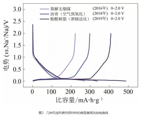 為了獲得比容量更高的下一代碳類負(fù)極,作者團(tuán)隊(duì)深入研究了無(wú)定形碳的儲(chǔ)Na機(jī)理,并基于對(duì)機(jī)理的理解,通過(guò)多種方式調(diào)控了碳的微結(jié)構(gòu),進(jìn)一步提升了碳類材料的比容量。瀝青是一種價(jià)格低廉的石油工業(yè)殘?jiān)?,在公路鋪設(shè)、房屋修補(bǔ)等方面有廣泛使用,但按照傳統(tǒng)高溫處理法制備的樣品可逆比容量不足100 mA·h/g。作者團(tuán)隊(duì)通過(guò)簡(jiǎn)單的在空氣中低溫預(yù)氧化和在惰性氣氛中高溫碳化的方法,可以將可逆比容量提高到約300 mA·h/g。預(yù)氧化過(guò)程中引入了含氧官能團(tuán),以抑制瀝青高溫結(jié)構(gòu)有序重排,從而達(dá)到提升微結(jié)構(gòu)無(wú)序度進(jìn)而提升儲(chǔ)鈉容量的目的。進(jìn)一步地,作者團(tuán)隊(duì)利用酚醛樹脂(塑料、加工行業(yè)常用原材料,也稱電木)作為前驅(qū)體、乙醇作為造孔劑,通過(guò)形成閉合孔隙的策略來(lái)精確調(diào)控硬碳微觀結(jié)構(gòu),得到的硬碳負(fù)極可逆比容量約為410 mA·h/g,甚至超過(guò)了石墨的儲(chǔ)鋰容量。以上3代碳類負(fù)極材料的首周充放電曲線如圖3所示。