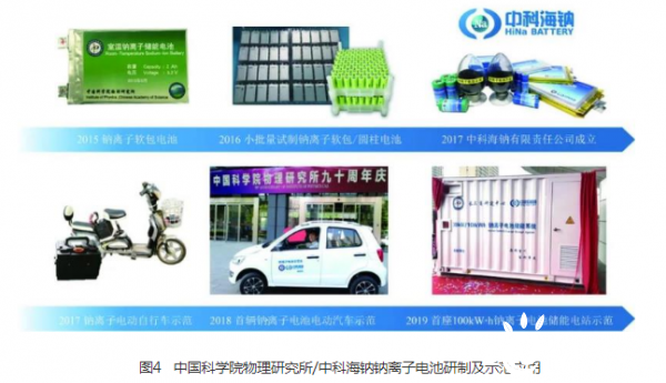 作者團(tuán)隊(duì)于2015年試制了鈉離子軟包電池之后,持續(xù)推進(jìn)工程化進(jìn)程,并于2015年底實(shí)現(xiàn)了10公斤級(jí)電極材料試制,2016年實(shí)現(xiàn)了鈉離子電池軟包電池和圓柱電池的小批量制造(圖4)。在發(fā)現(xiàn)和解決實(shí)際生產(chǎn)中所面臨問(wèn)題的過(guò)程中,進(jìn)一步加深了對(duì)鈉離子電池性能的理解并積累了一些前期研制經(jīng)驗(yàn)。2017年2月初,致力于開發(fā)低成本、高性能鈉離子電池的北京中科海鈉有限責(zé)任公司成立,中科海鈉在2017年底開始了鈉離子電池從電極材料、電解液、電池制造以及成組測(cè)試的整條生產(chǎn)與測(cè)試線的建設(shè)和初步運(yùn)行。2017年底,作者團(tuán)隊(duì)推出了鈉離子電池(48 V,10 A·h)驅(qū)動(dòng)的電動(dòng)自行車(圖4);2018年6月作者團(tuán)隊(duì)推出了全球首輛鈉離子電池(72 V,80 A·h)驅(qū)動(dòng)的低速電動(dòng)汽車(圖4)。該車亮相于2018年6月9日物理所90周年所慶日,陳立泉院士親自為該電動(dòng)汽車揭幕并試駕了該車;2019年3月29日,作者團(tuán)隊(duì)發(fā)布了世界首座30 kW/100 kW·h鈉離子電池儲(chǔ)能電站,目前為中科院物理所長(zhǎng)三角研究中心供電。儲(chǔ)能電站可實(shí)現(xiàn)“谷電峰用”的用電模式,緩解電網(wǎng)供給側(cè)的不平衡狀況,利用峰谷電價(jià)差不僅可以降低用電成本,也可以減小風(fēng)能、光能并網(wǎng)對(duì)電網(wǎng)帶來(lái)的沖擊,對(duì)于新能源的發(fā)展有推動(dòng)作用。在中國(guó)科學(xué)院戰(zhàn)略性先導(dǎo)科技專項(xiàng)的支持下,作者團(tuán)隊(duì)計(jì)劃于2021年推出1 MW·h的鈉離子電池儲(chǔ)能系統(tǒng)。
