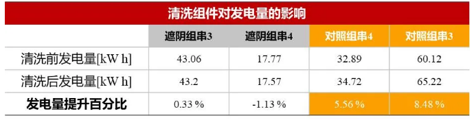 結果顯示:不受樹蔭遮擋的組串(對照組串3和4)在清洗之后,發(fā)電量提升超過5%;而對遮陰組串3和4,清洗對其發(fā)電量幾乎無影響。