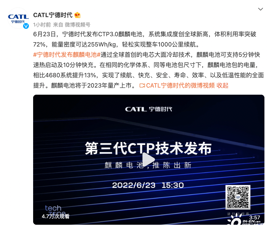 重磅!寧德時(shí)代發(fā)布麒麟電池,電量比特斯拉4680電池提升13%,將在2023年上市