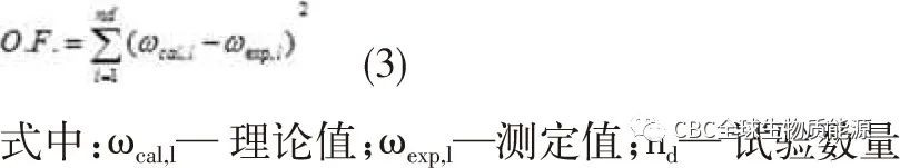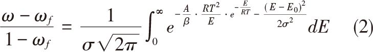 使上述函數(shù)達(dá)到最小值時(shí)的參數(shù)值即為所求解參數(shù)的過程,實(shí)際上轉(zhuǎn)變成了一個(gè)優(yōu)化問題,運(yùn)行Matlab中的遺傳算法,即可求出使公式(3)最小值的最優(yōu)函數(shù),從而求得參數(shù)值A(chǔ),E0,σ的解,E0=125kJ/mol,指前因子A=1.5×109s-1和標(biāo)準(zhǔn)差σ=10kJ/mol。