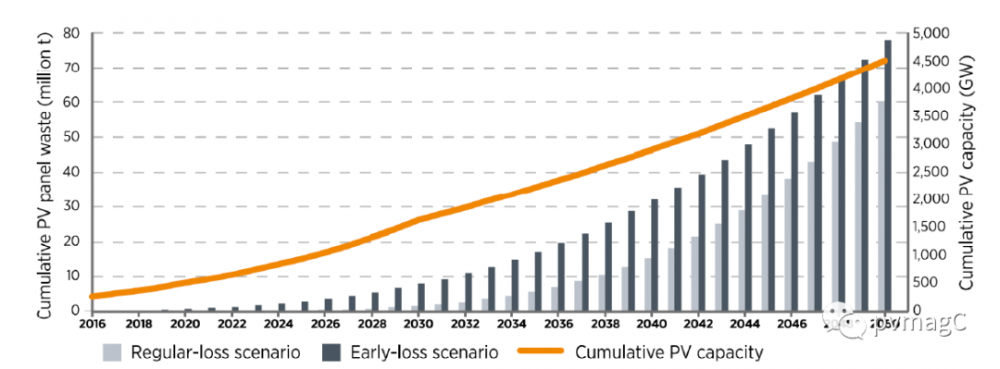 根據(jù)國(guó)際能源署光伏發(fā)電系統(tǒng)計(jì)劃(IEA PVSP)和國(guó)際可再生能源署(IRENA)在2016年分析的常規(guī)損失情景,預(yù)計(jì)到2030年報(bào)廢光伏組件的廢物量將達(dá)到170萬噸左右,且預(yù)計(jì)到2050年將達(dá)到約6000萬噸。如果出現(xiàn)早期損失情景,則到2030年可能會(huì)有800萬噸光伏廢物,到2050年廢物總量將達(dá)到7800萬噸。