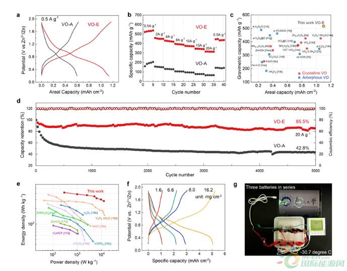 采用電化學循環(huán)伏安方法在碳電極表面沉積氧化釩納米帶材料,其結晶度低。借助高分辨透射電子顯微手段,作者發(fā)現(xiàn)電極材料內部存在大量無定型與納米結晶區(qū)域,形成豐富的無定型-結晶異質界面網(wǎng)絡。這與純結晶態(tài)氧化釩具有顯著區(qū)別。這種新穎的異質界面網(wǎng)絡,可實現(xiàn)高效電荷傳遞,加速電子、離子在電極表面的電荷轉移及電極內部的輸運。因此,無定型-結晶異質結構氧化釩材料表現(xiàn)出優(yōu)異的電化學性能,例如高質量/面積比容量(516 mAh g-1,~5 mAh cm-2),良好的循環(huán)穩(wěn)定性,以及良好的低溫適用性。